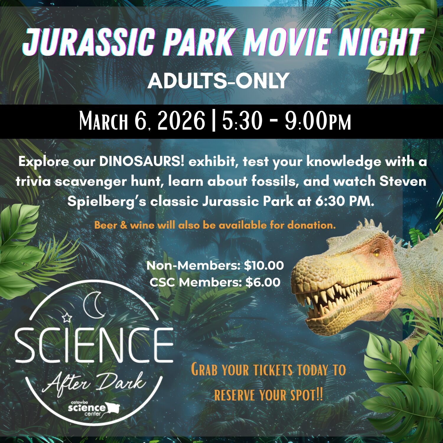 Explore DINOSAURS! at CSC—without children! Test your knowledge with dinosaur trivia during a scavenger hunt, learn about fossils (including fun with amber resin), and enjoy Steven Spielberg’s classic Jurassic Park. Beer and wine will be available for a donation.   Exhibits and activities open at 5:30 PM on March 6th, with the movie starting at 6:30 PM. Stay afterward for a discussion about the film and the science behind it.   Pre-purchased tickets are required to reserve your spot. Quantities are limited and available on a first-come, first-served basis. Any remaining tickets may be available for purchase at the door.   Non-Members: $10.00Members: $6.00   CSC Members receive discounted admission as part of their member benefits; however, pre-registration is required.